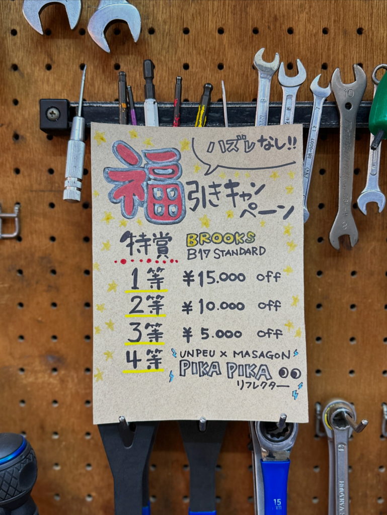店頭で自転車ご購入のお客様にくじを引いてもらって、商品のプレゼントや割引などが当たります!
